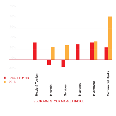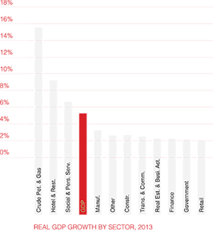 شهد الاقتصاد الوطني في عام 2012 نمواً بنسبة %4.3، ولكنه حقق المزيد من التوسع الاقتصادي في عام 2013 بلغ %5.3، حسب البيانات التي أصدرها الجهاز المركزي للمعلومات. وكان قطاع النفط الخام والغاز الطبيعي هو الأسرع نمواً (%3.15)، وتبعه قطاع الفنادق والمطاعم (%5.9)، والخدمات الاجتماعية والشخصية %5.6. وقد شهد القطاع غير النفطي نمواً بنسبة %3.