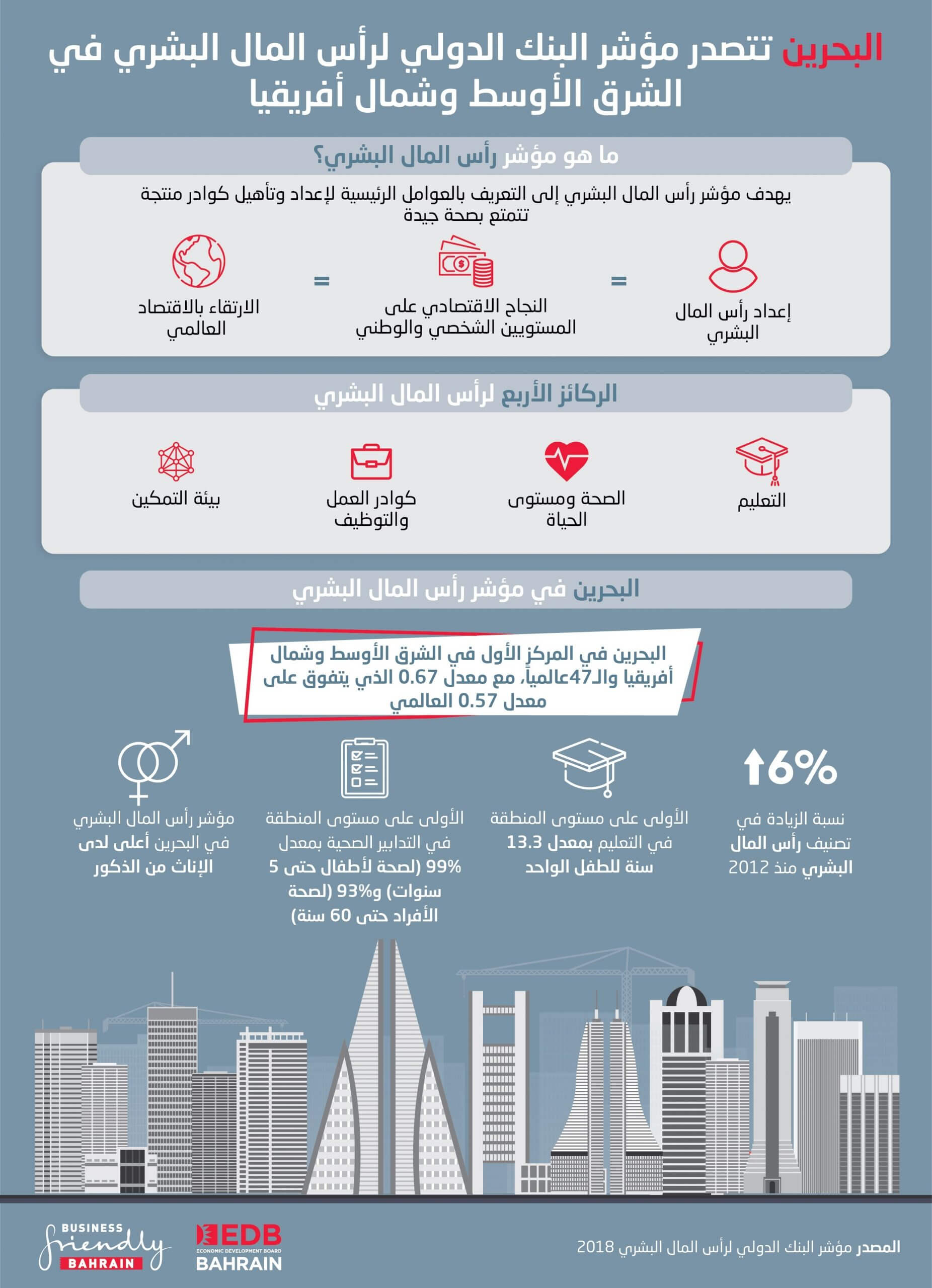المنامة، 17 أكتوبر 2018: تصدّرت مملكة البحرين النسخة الأولى من مؤشر البنك الدولي لرأس المال البشري في منطقة الشرق الأوسط وشمال أفريقيا، والذي يركز على قطاعي الصحة والتعليم، ويقيس إنتاجية المواليد الجدد عند بلوغهم سن الثامنة عشرة.